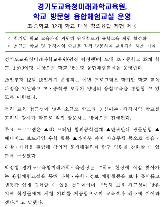 [보도자료] 경기도교육청미래과학교육원, 학교 방문형 융합체험교실 운영 2025.12.01 조회수 204 김수경 |