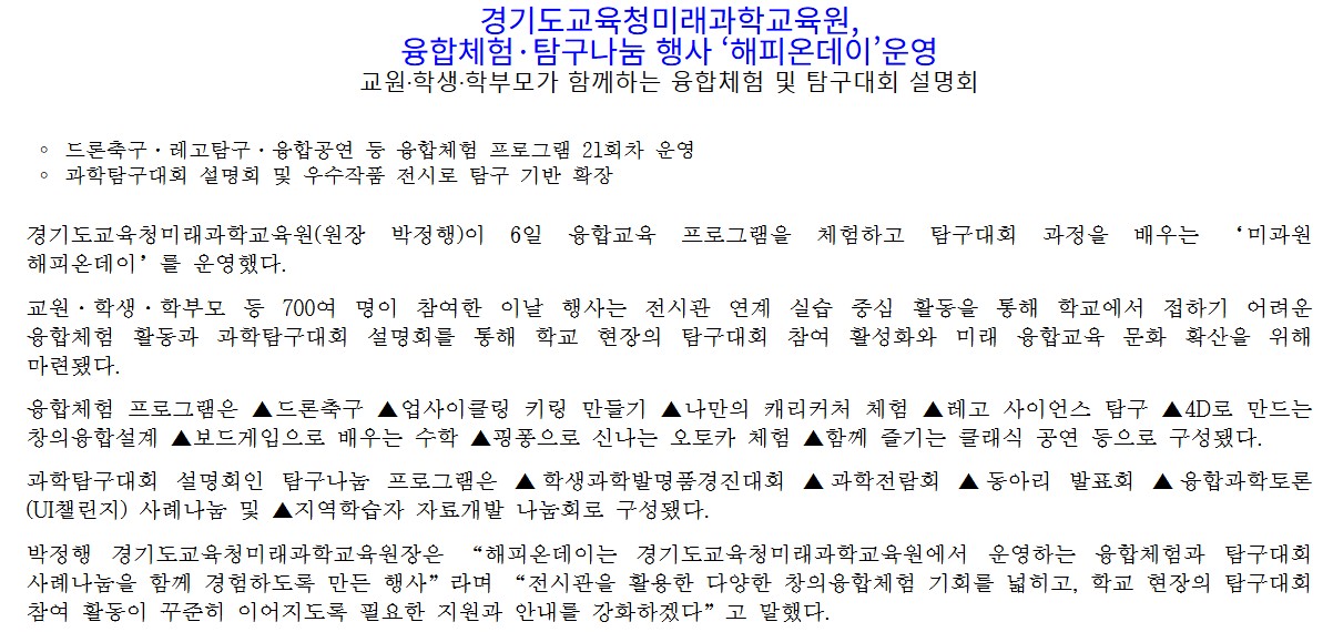 [보도자료] 경기도교육청미래과학교육원 융합체험탐구나눔 행사 '해피온데이' 운영 2025.12.15 조회수 116 김수경 |