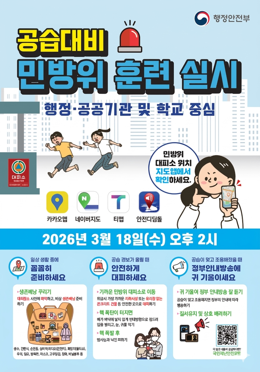 2026년 3월 공습 대비 민방위훈련(3. 18.) 일정을 안내 드리오니 방문에 참고하시길 바랍니다. |