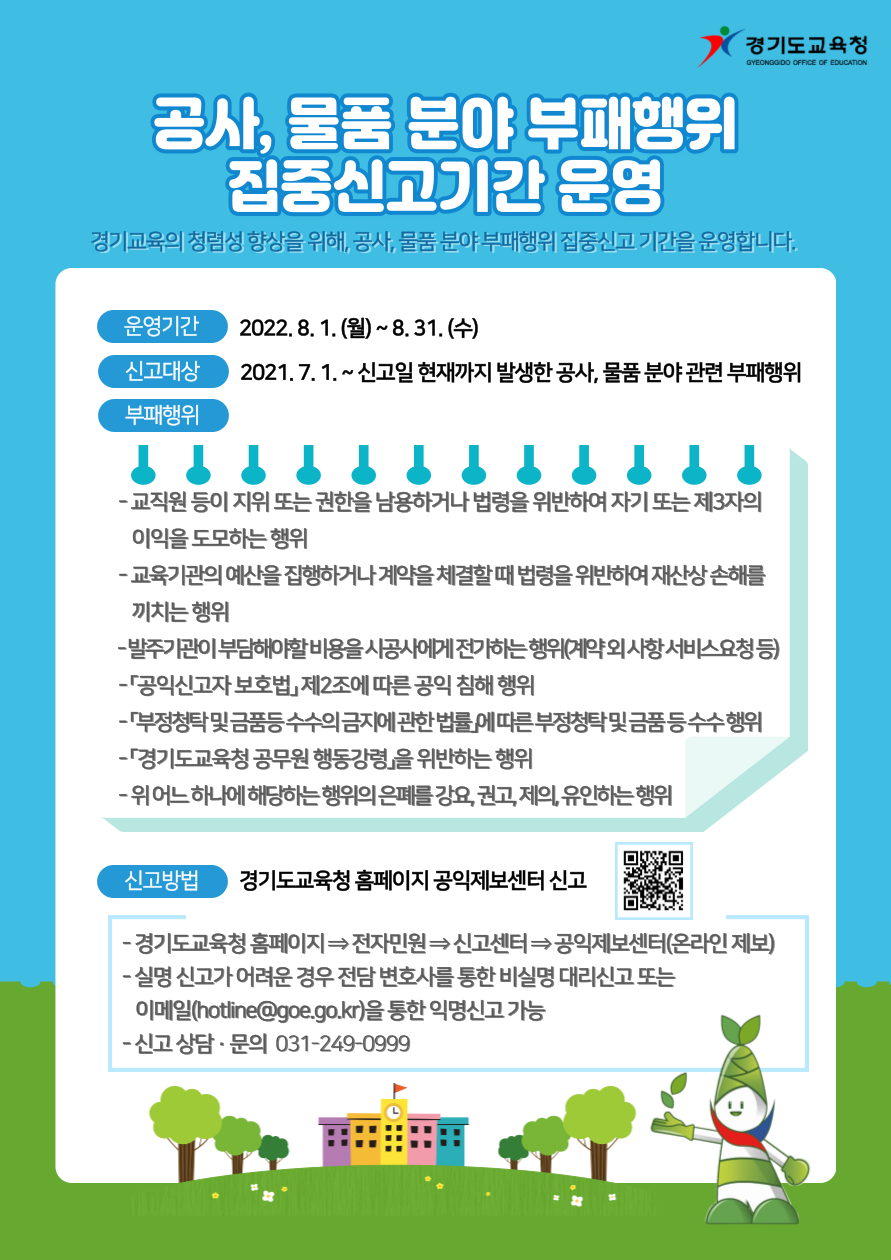 <부패, 갑질행위 집중신고기간 운영 안내> 가. 기간별 집중신고기간 운영개요 1) 5월 19일 ~ 6월 30일: 이해충돌방지법 위반행위 2) 7월 11일 ~ 7월 22일: 갑질행위 3) 8월 1일 ~ 8월 31일: 물품, 공사 관련 부패행위 나. 신고방법: 경기도교육청 홈페이지 전자민원>신고센터(유형별 신고) 1) 공익제보센터 신고 2) 갑질 및 직장 내 괴롭힘 신고센터 ![]()