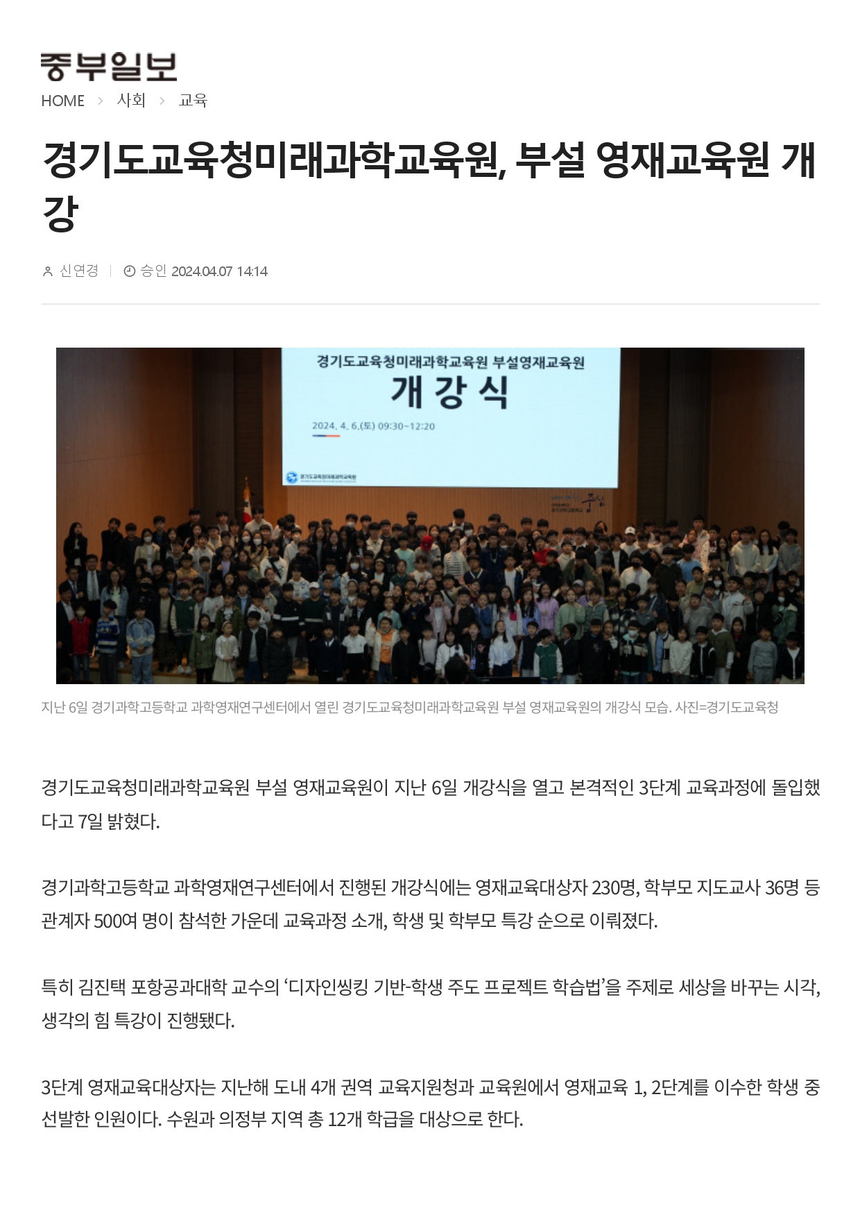 | 첨부파일 | 240406 경기도교육청미래과학교육원 부설영재교육원, 개강식 개최.hwp |