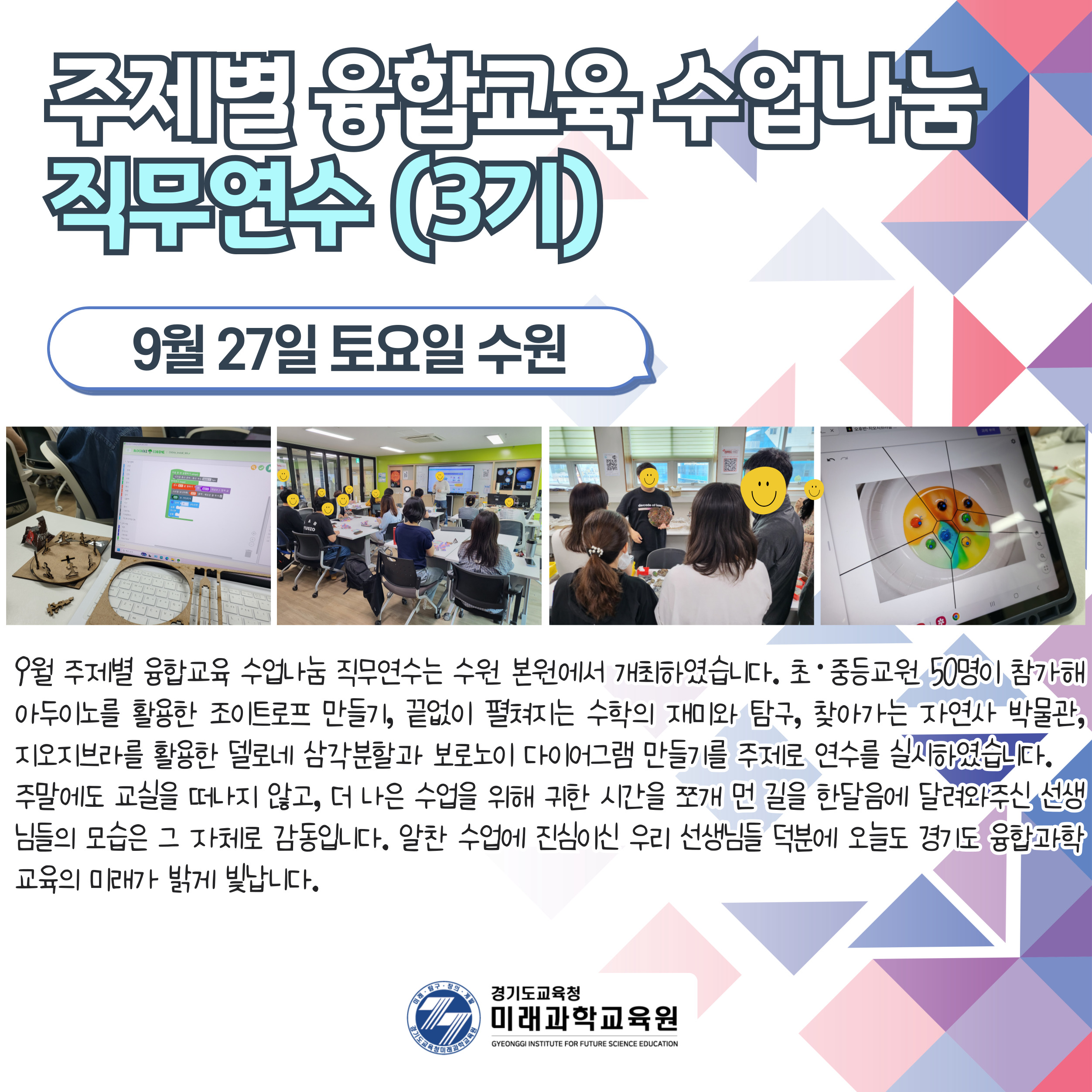 2025 주제별 융합교육 수업나눔 직무연수(3기) 운영 2025.09.29 조회수 312 송희련 |