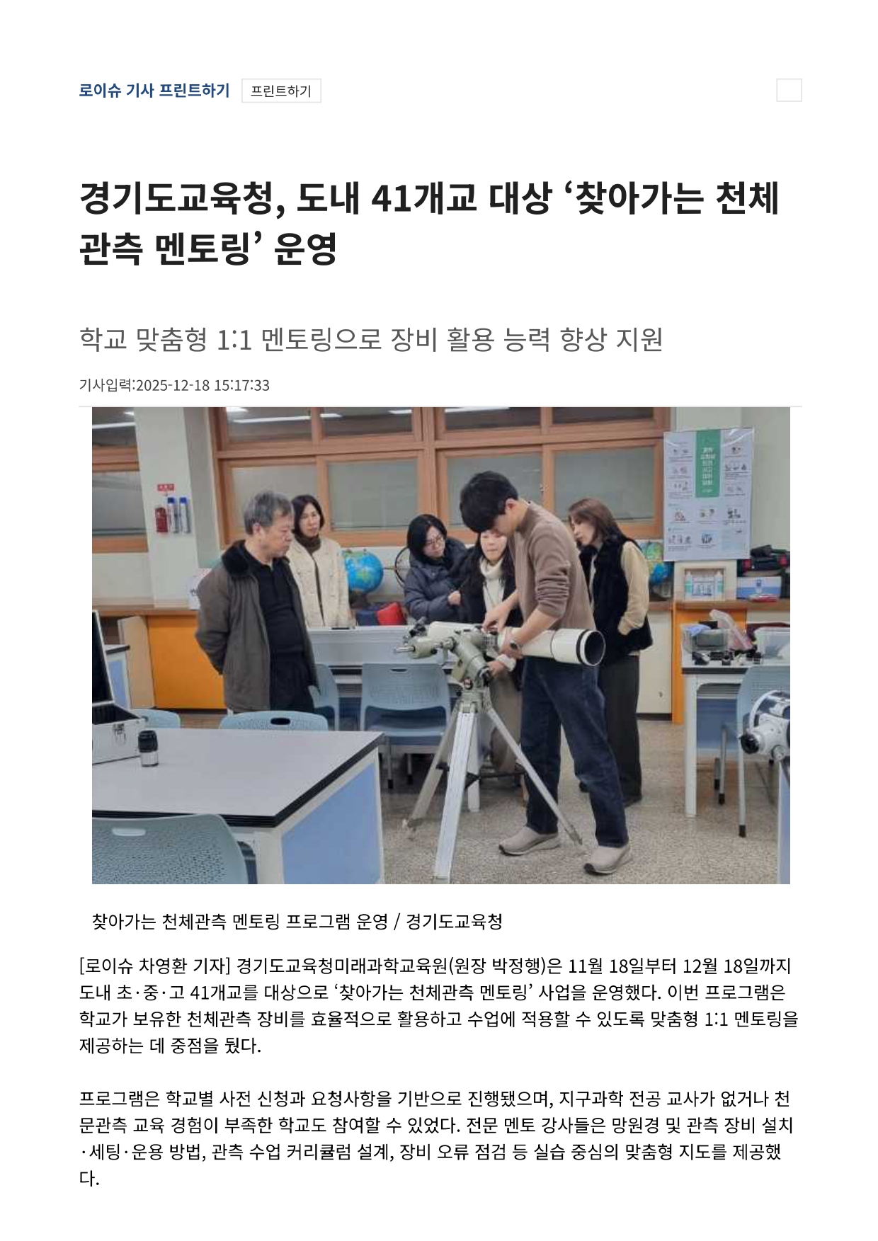 경기도교육청미래과학교육원, 도내 41개교 대상 '찾아가는 천체 관측 멘토링'운영 2025.12.22 조회수 171 신연옥 |