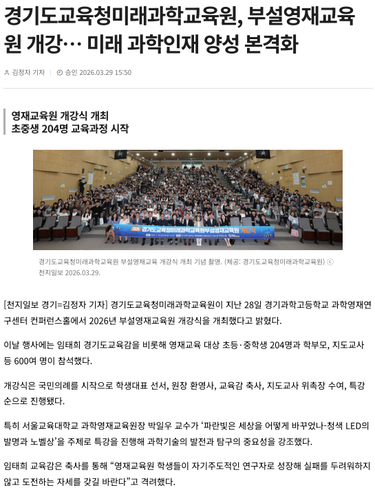2026년 경기도교육청미래과학교육원, '부설영재교육원 개강식' 개최 2026.04.07 조회수 34 김인구 |