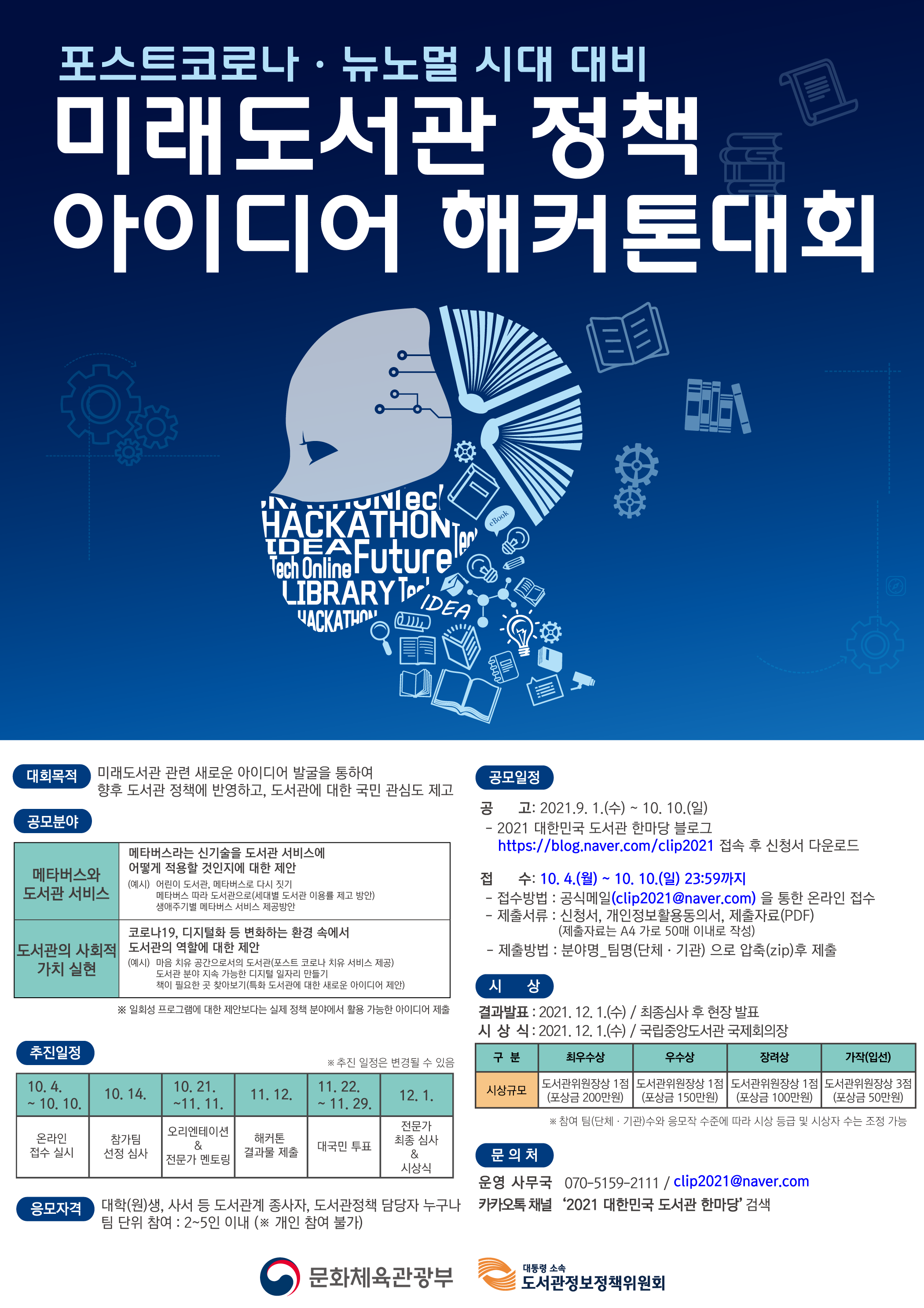 | 첨부파일 | 202109_미래도서관 정책 아이디어 해커톤대회 모집공고.hwp |