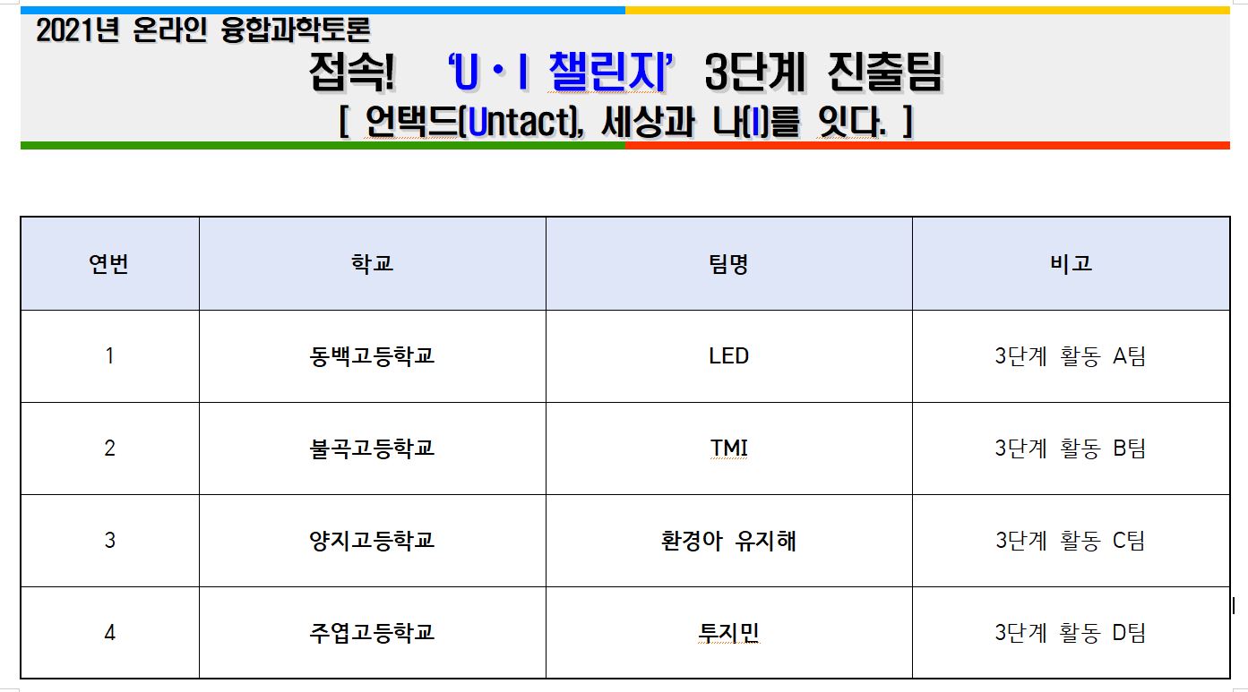 | 첨부파일 | 202109_온라인 융합과학토론 접속 UI챌린지 3단계 진출팀 명단.JPG |