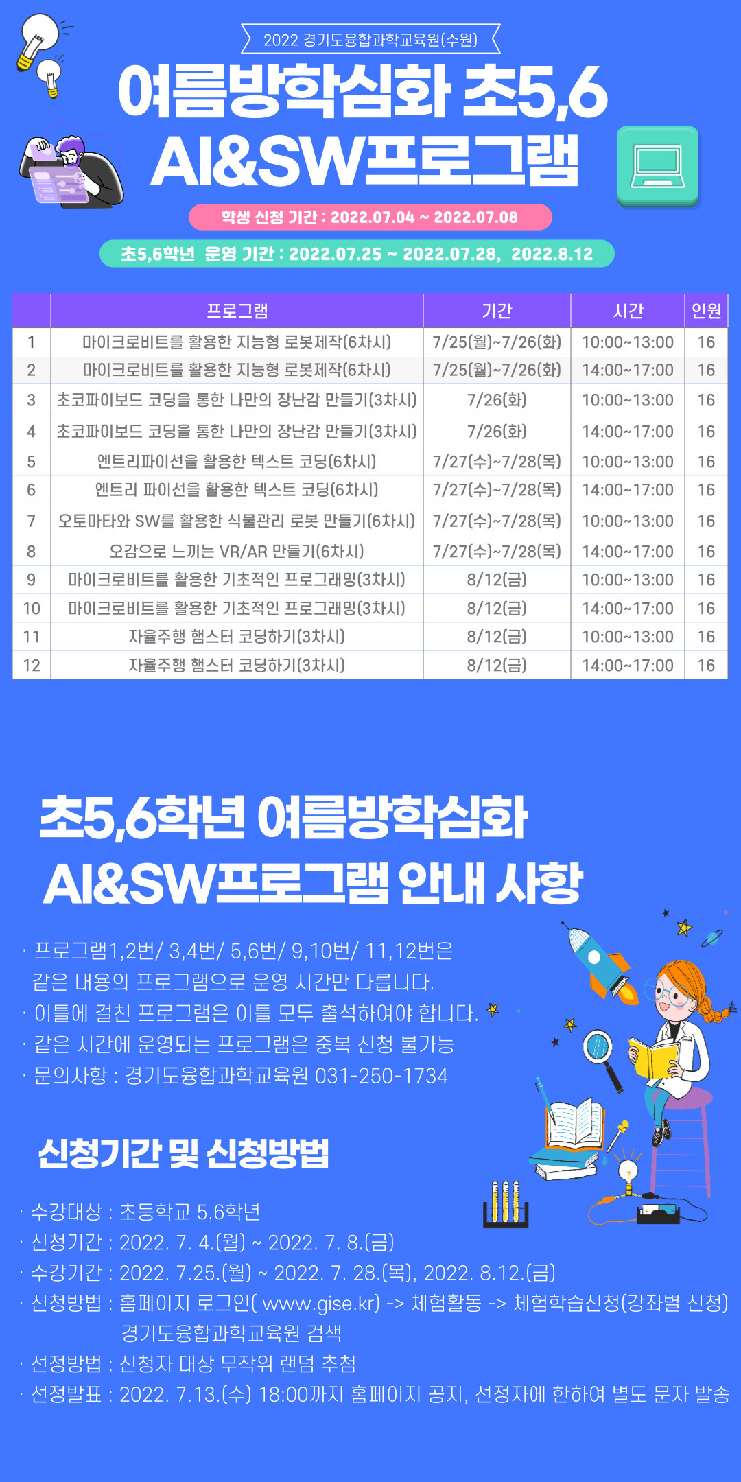 [신청_수원][초5,6학년] 7,8월 미래와 만나는 방학체험교실 신청 안내(7/4~7/8) 2022.06.29 조회수 7,592 오연경 |