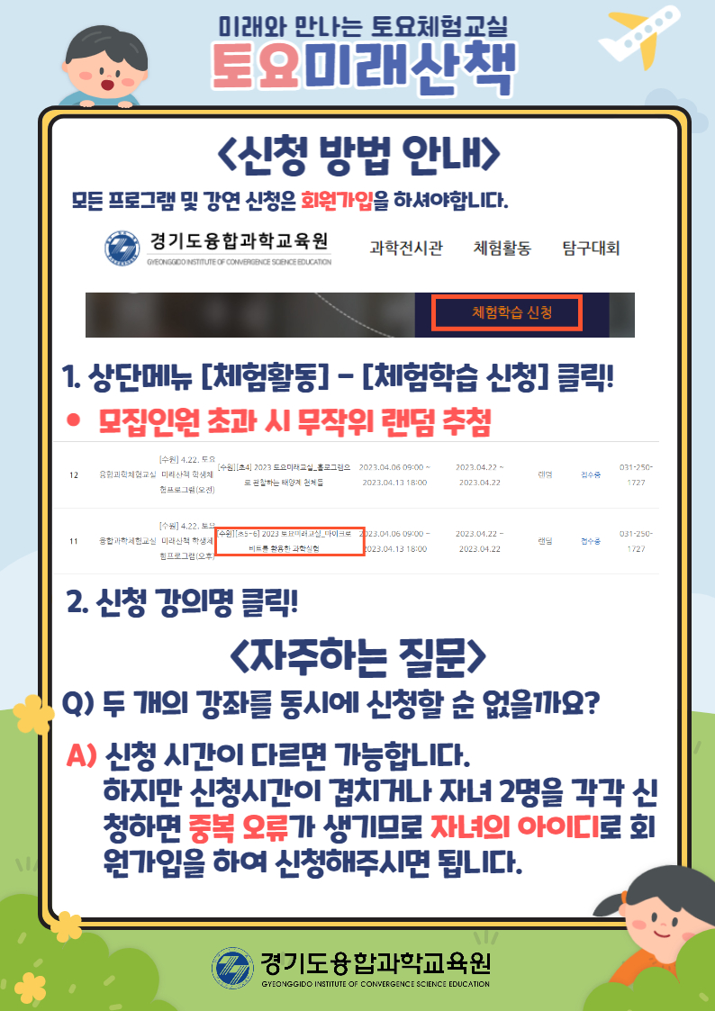 2023 4월 22일 토요미래산책 (융합체험프로그램 및 융합 강연) 신청방법 안내 2023.04.07 조회수 8,191 최웅비 |