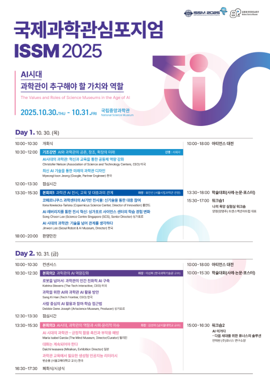 [행사 개요] - 행사명 : 제15회 국제과학관심포지엄 - 일시 : 2025년 10월 30일(목)~31일(금) - 장소 : 국립중앙과학관(대전 유성구 소재) - 주최/주관 : 과학기술정보통신부/국립중앙과학관 - 후원 : 국립과천과학관, 국립광주과학관, 국립대구과학관, 국립부산과학관, 한국과학창의재단, 대전문화재단 |