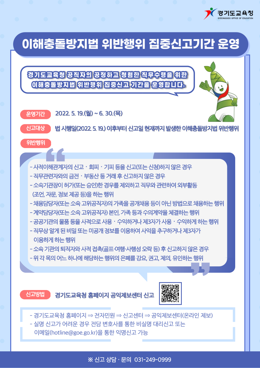 <부패, 갑질행위 집중신고기간 운영 안내> 가. 기간별 집중신고기간 운영개요 1) 5월 19일 ~ 6월 30일: 이해충돌방지법 위반행위 2) 7월 11일 ~ 7월 22일: 갑질행위 3) 8월 1일 ~ 8월 31일: 물품, 공사 관련 부패행위 나. 신고방법: 경기도교육청 홈페이지 전자민원>신고센터(유형별 신고) 1) 공익제보센터 신고 2) 갑질 및 직장 내 괴롭힘 신고센터 ![]()