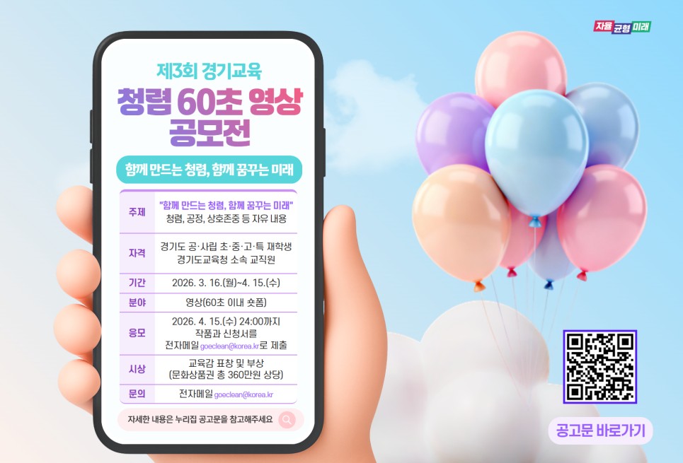 [공모] 2026년 '제3회 청렴 60초 영상 공모전' 개최 안내 2026.03.24 조회수 95 김우섭 |