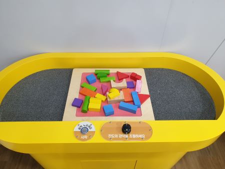진동판 위에 블록으로 건축물을 만들어 보고, 진동을 발생시켜서 지진이 발생했을 때 건축물에 미치는 영향을 체험해 볼 수 있습니다 .
